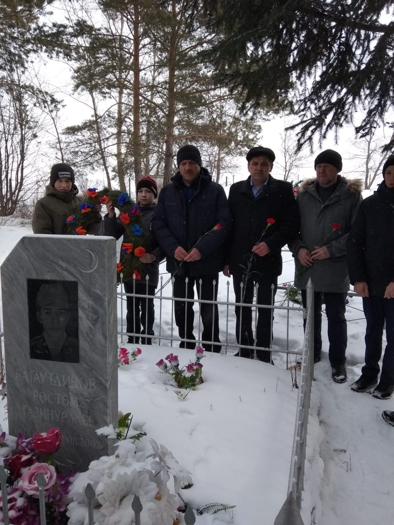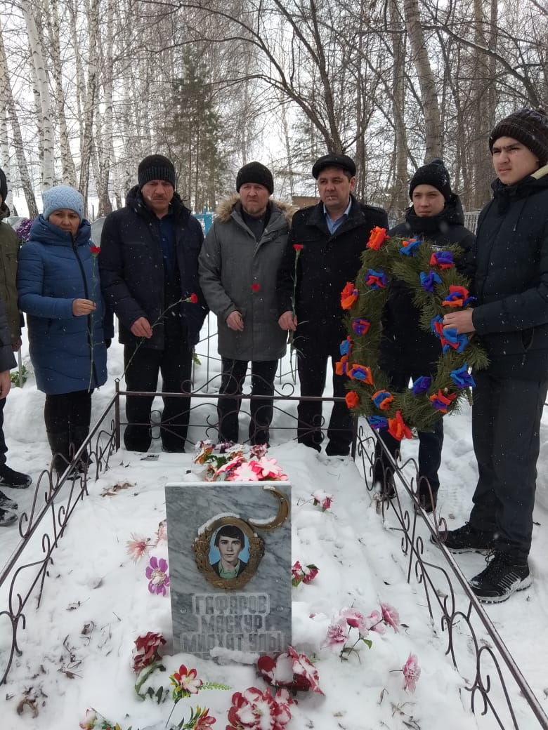 Ко дню памяти воинов-интернационалистов и вывода войск из Афганистана в школе прошел вечер памяти. Выступали обучающиеся и гости школы. Мы вспоминали воинов Афганистана и Чечни. А после мероприятия поехали возложить венки на могилы односельчан участника афганской войны — Гафарова Маскура Мидхатовича и чеченской войны — Багаутдинова Рустама Газинуровича.